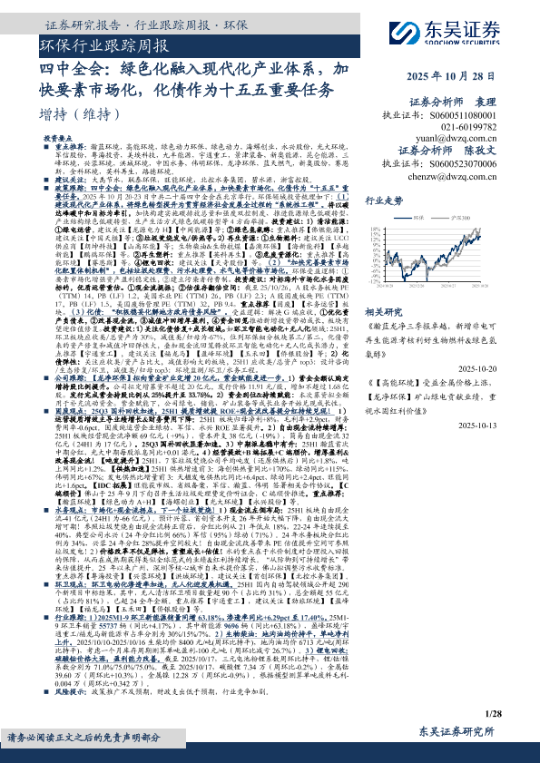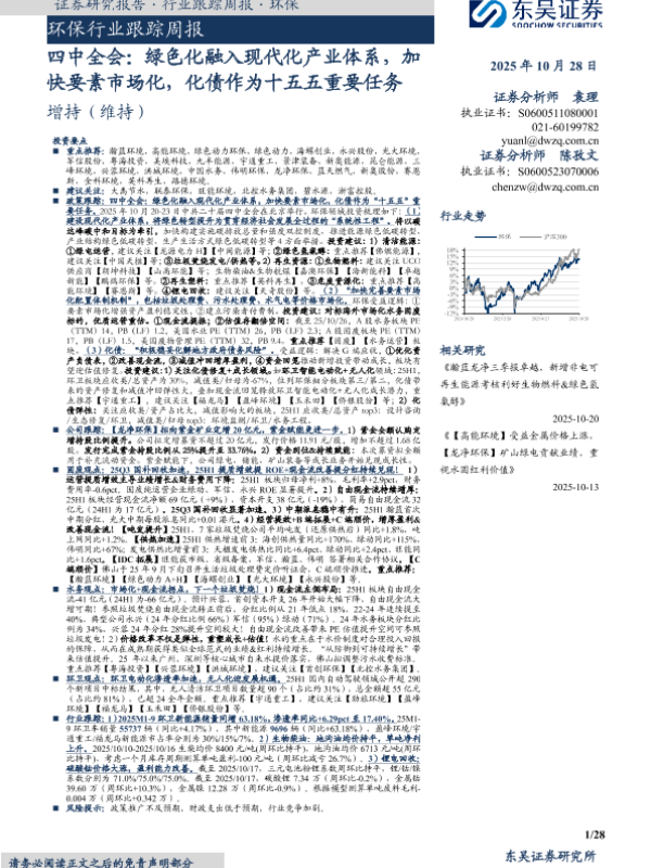 【东吴证券】【202510】环保行业跟踪周报:四中全会:绿色化融入现代化产业体系,加快要素市场化,化债作为十五五重要任务-28页
