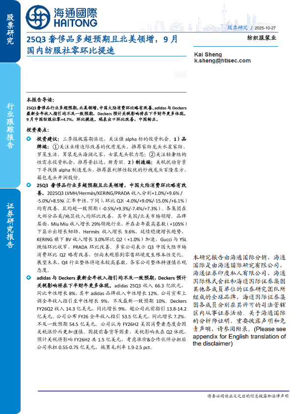【海通国际】【202510】25Q3奢侈品多超预期且北美领增,9月国内纺服社零环比提速-16页