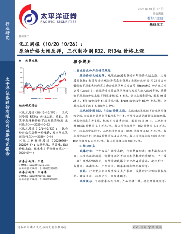 【太平洋证券】【202510】原油价格大幅反弹,三代制冷剂R32、R134a价格上涨-34页