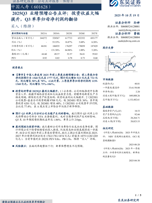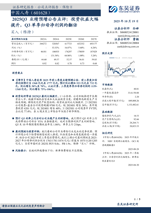 利率上行 保险 归母净利润 投资收益 权益投资