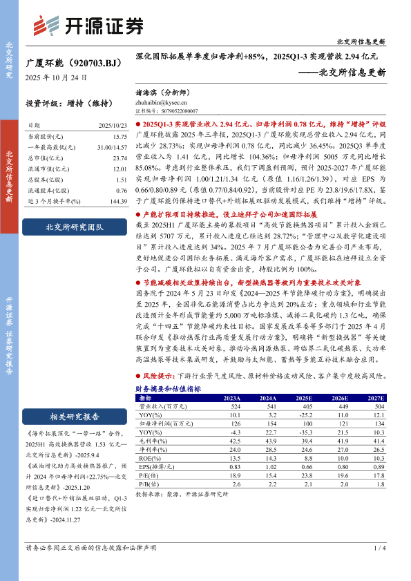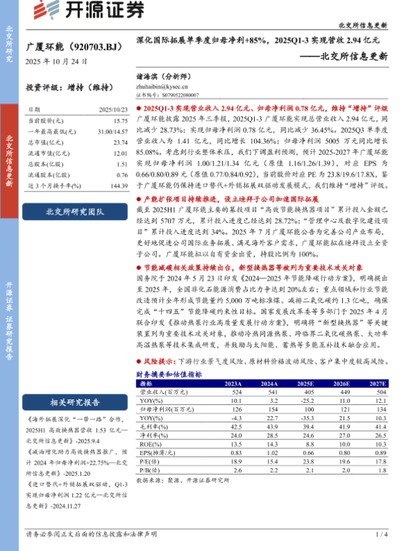 北交所 广厦环能 增持评级 三季报 海外拓展