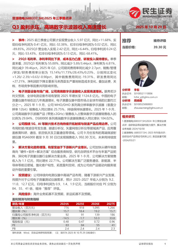 【民生证券】【202510】2025年三季报点评:Q3盈利承压,高端数字示波器收入高速增长-3页