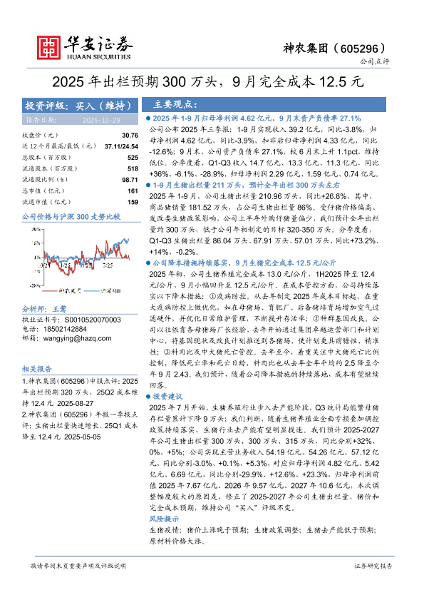 【华安证券】【202510】2025年出栏预期 300万头,9月完全成本 12.5元-4页