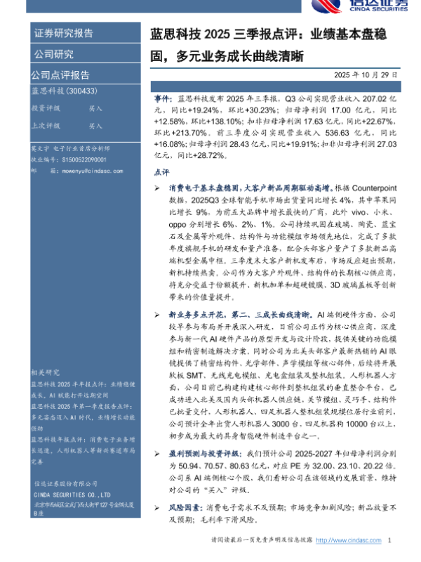 【信达证券】【202510】蓝思科技2025三季报点评:业绩基本盘稳固,多元业务成长曲线清晰-5页
