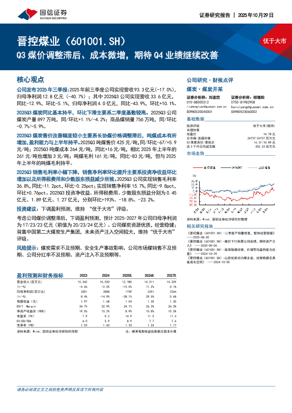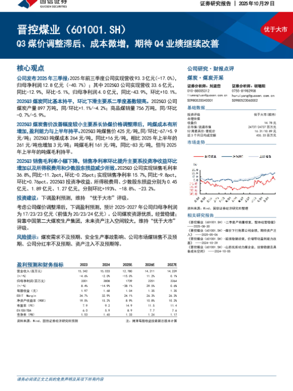 【国信证券】【202510】晋控煤业(601001.SH)-Q3煤价调整滞后、成本微增,期待Q4业绩继续改善-4页