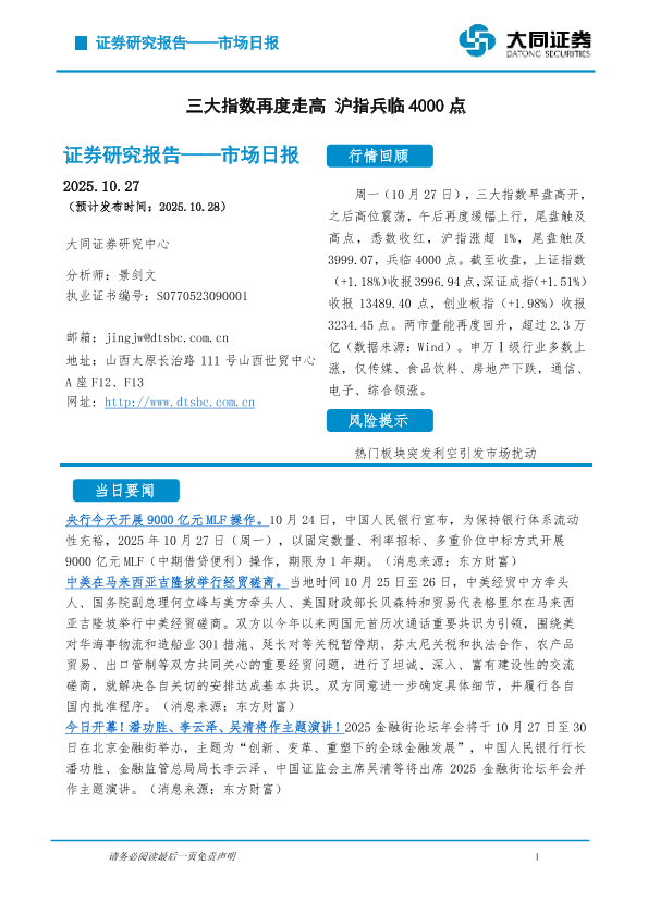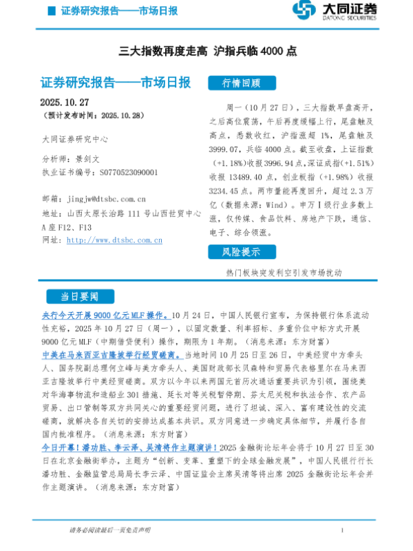 【大同证券研究中心】【202510】市场日报:三大指数再度走高 沪指兵临4000点-5页