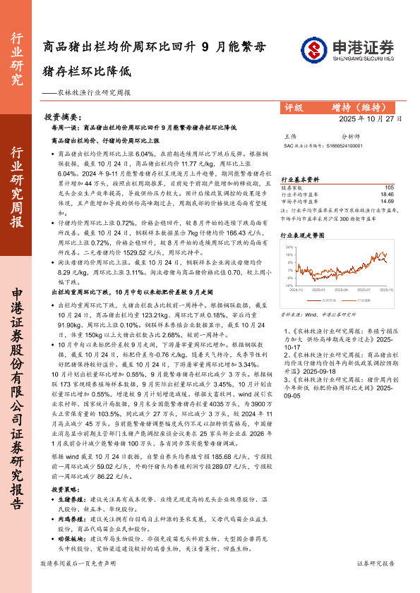 【申港证券】【202510】商品猪出栏均价周环比回升 9月能繁母猪存栏环比降低——农林牧渔行业研究周报-8页
