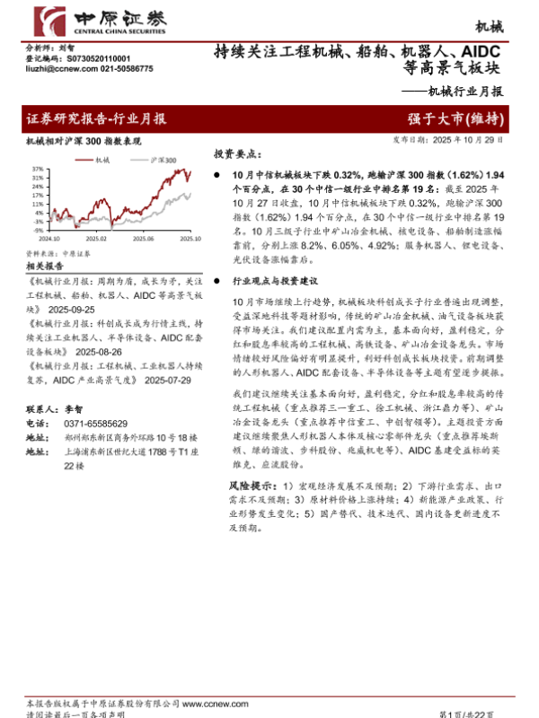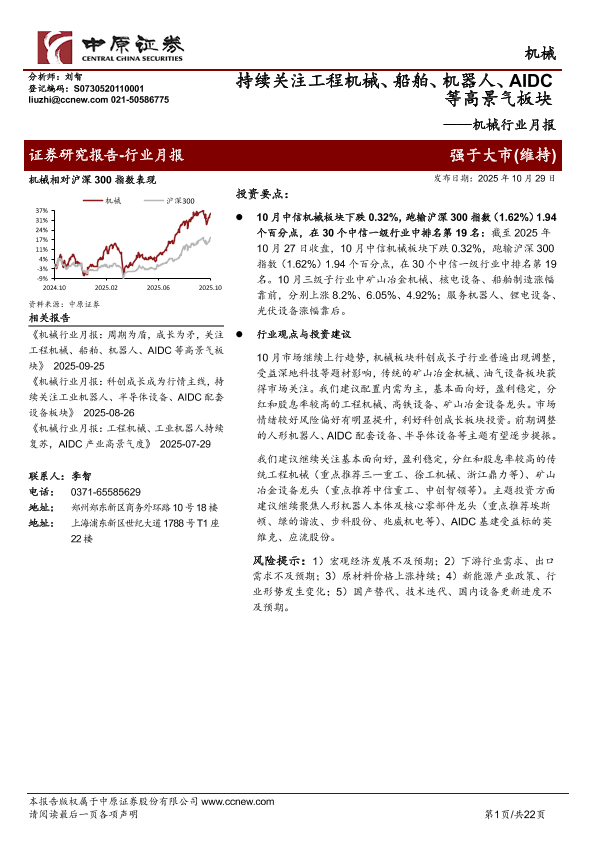 【中原证券】【202510】机械行业月报:持续关注工程机械、船舶、机器人、AIDC等高景气板块-22页