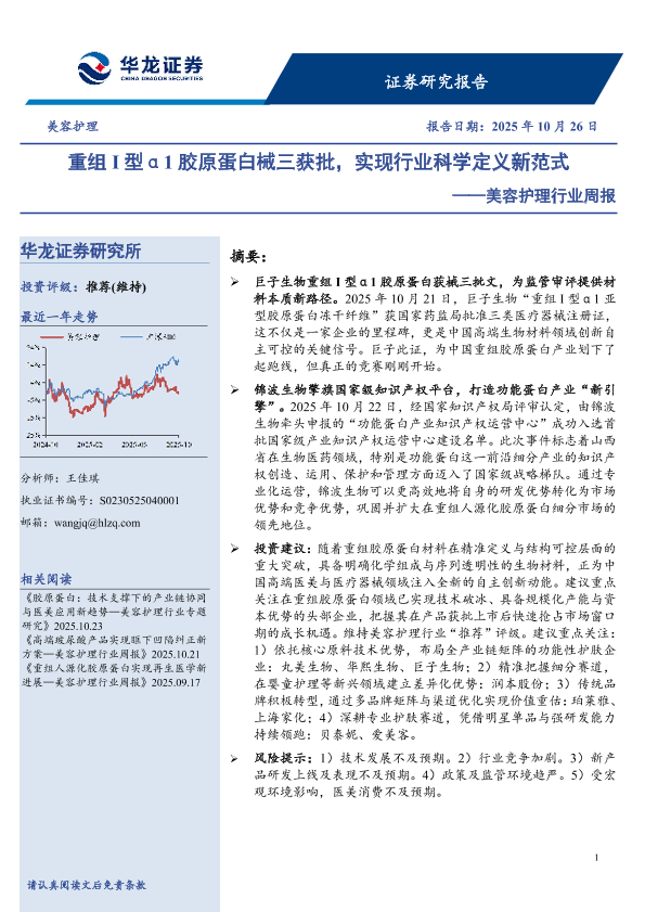 【华龙证券】【202510】重组 I型α1胶原蛋白械三获批,实现行业科学定义新范式-9页