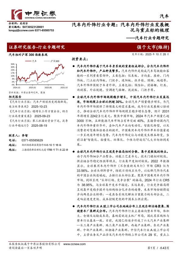 【中原证券】【202510】汽车内外饰行业专题:汽车内外饰行业发展概况与重点标的梳理-43页