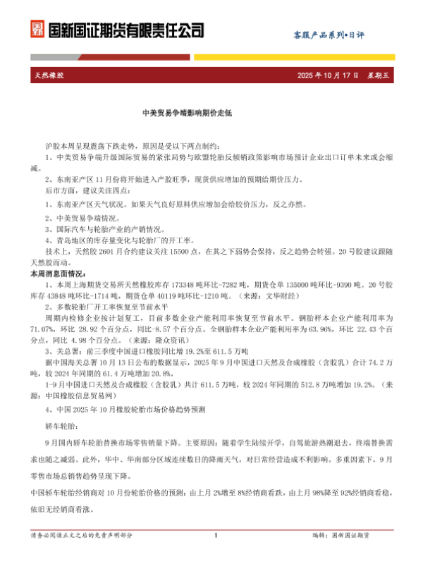 【国新国证期货】【202510】天然橡胶日评_中美贸易争端影响期价走低-2页