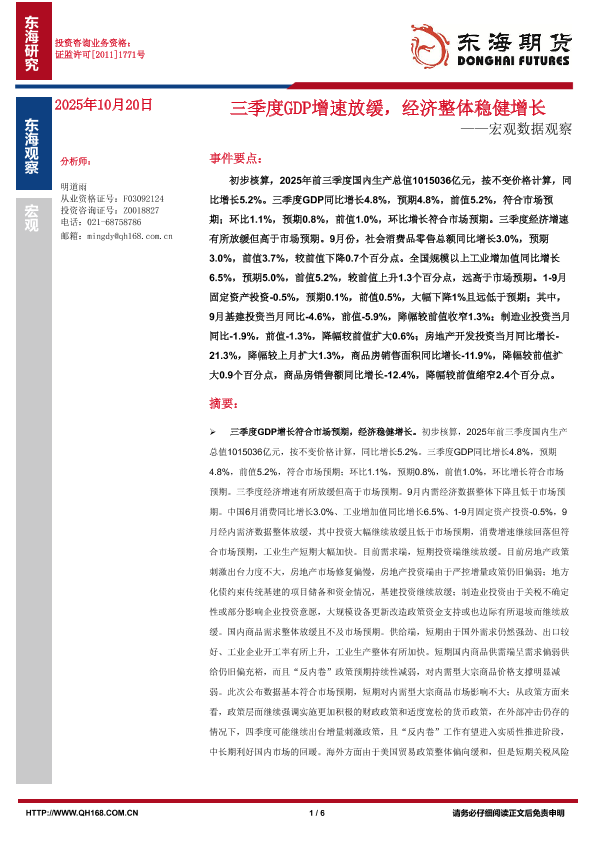 【东海期货】【202510】三季度GDP增速放缓,经济整体稳健增长-6页
