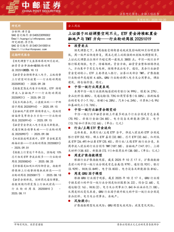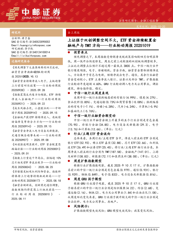 【中邮证券】【202510】上证强于双创调整空间不大,ETF资金持续配置金融地产与TMT方向-16页