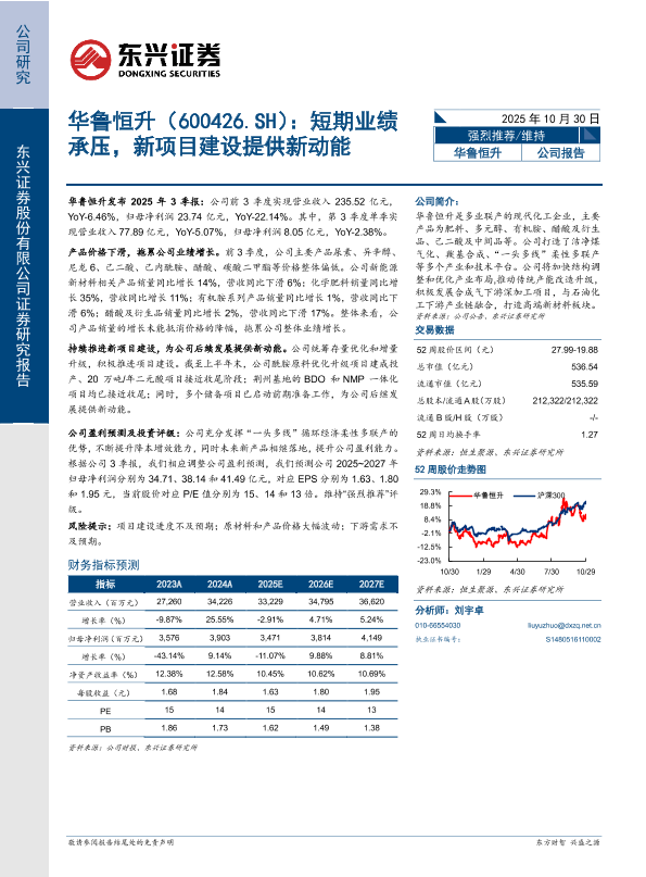 【东兴证券】【202510】华鲁恒升(600426.SH):短期业绩承压,新项目建设提供新动能-4页