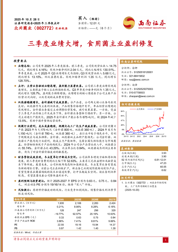 【西南证券】【202510】2025年三季报点评:三季度业绩大增,食用菌主业盈利修复-6页