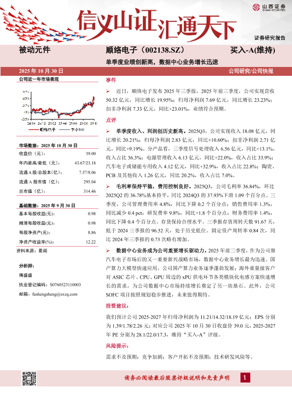 被动元件 顺络电子 业绩增长 股票评级 数据中心