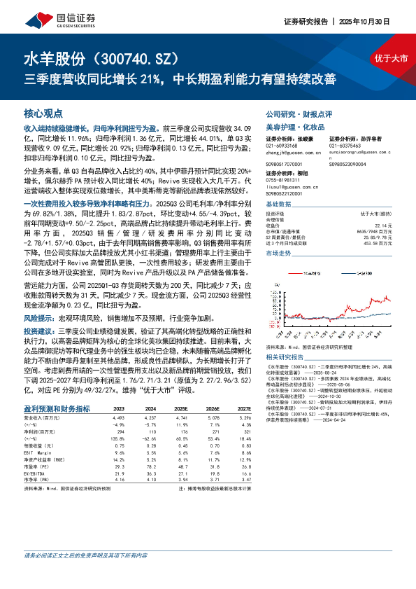 【国信证券】【202510】2025年10月30日 优于大市 水羊股份(300740.SZ) 三季度营收同比增长21%,中长期盈利能力有望持续改善-6页