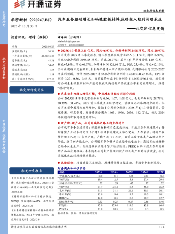 【开源证券】【202510】汽车新客户与新材料进展值得期待,成本增加致业绩承压,2025H1营收同比+6.49%—北交所信息更新-4页