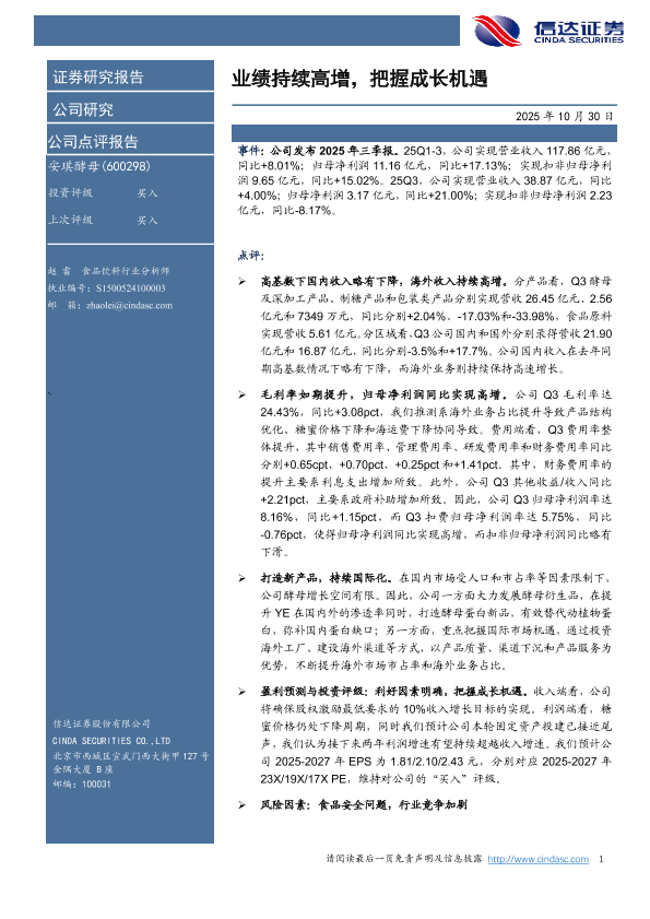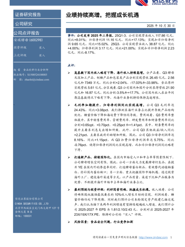 毛利率提升 业绩增长 投资评级买入 安琪酵母 海外业务