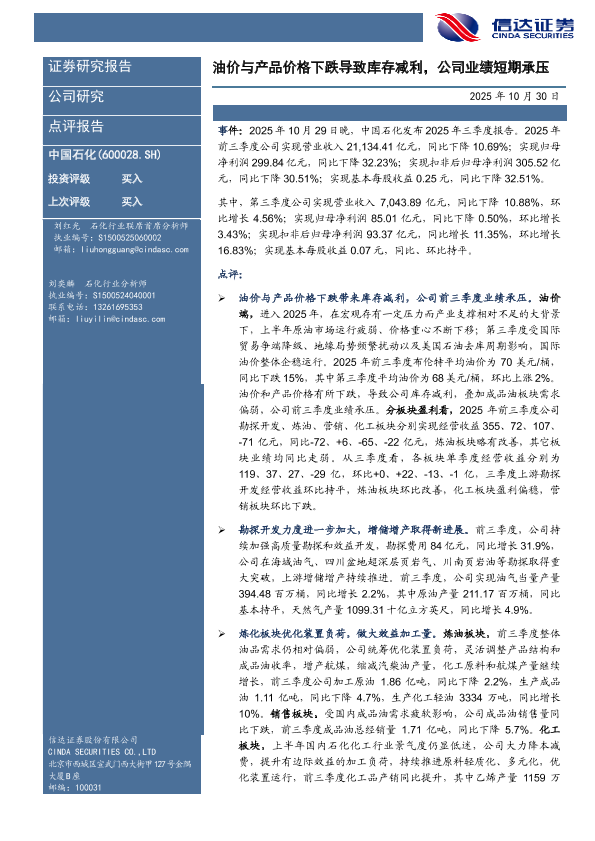 【信达证券】【202510】油价与产品价格下跌导致库存减利,公司业绩短期承压-5页