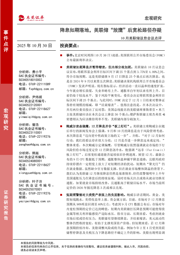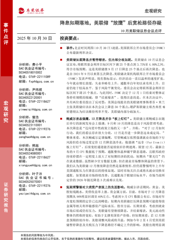 【东莞证券】【202510】10月美联储议息会议点评:降息如期落地,美联储“放鹰”后宽松路径存疑-4页