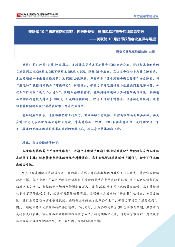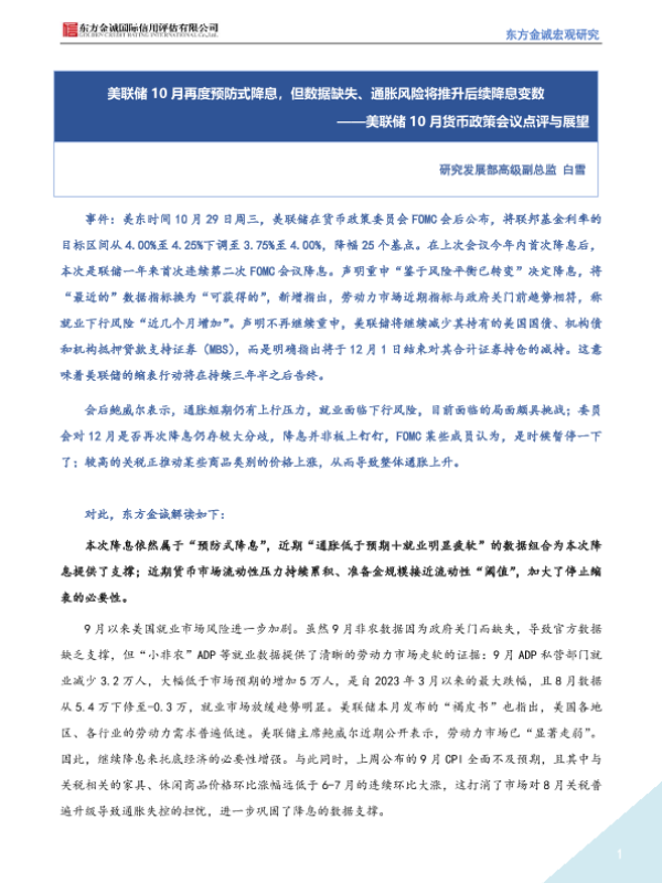 【东方金诚】【202310】美联储10月货币政策会议点评与展望:美联储10月再度预防式降息,但数据缺失、通胀风险将推升后续降息变数-3页