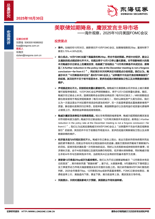 【东海证券】【202510】海外观察:2025年10月美国FOMC会议:美联储如期降息,鹰派发言主导市场-3页