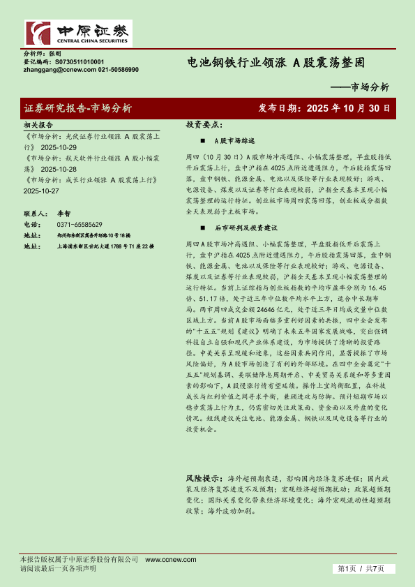 【中原证券】【202510】电池钢铁行业领涨 A股震荡整固-7页