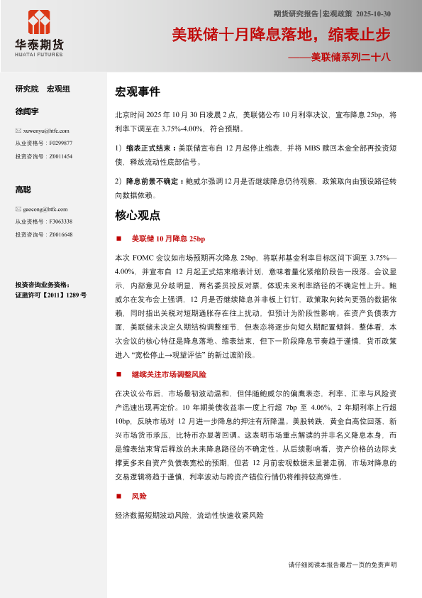 【华泰期货】【202510】美联储十月降息落地,缩表止步-6页