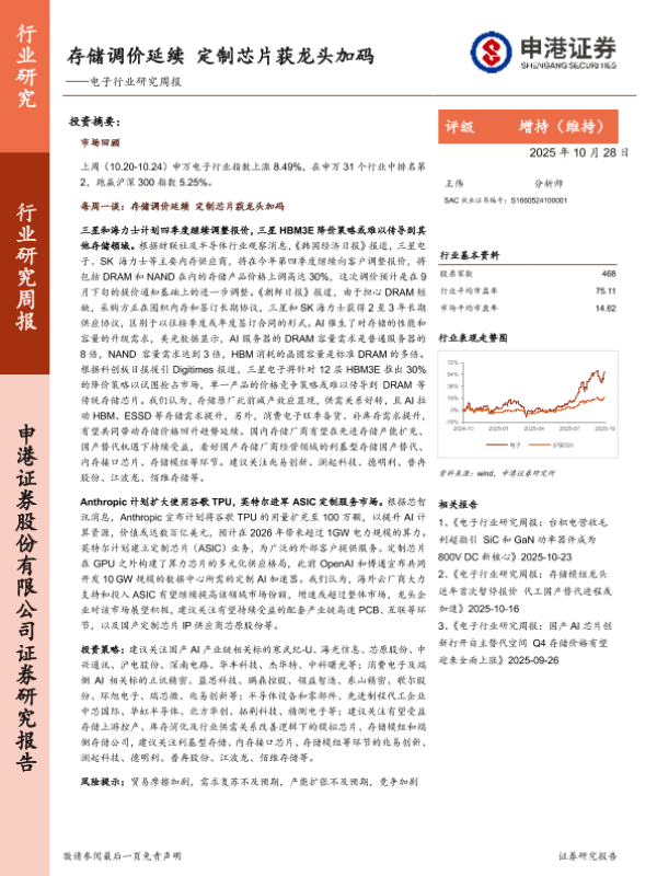 【申港证券】【202510】存储调价延续定制芯片获龙头加码——电子行业研究周报-11页