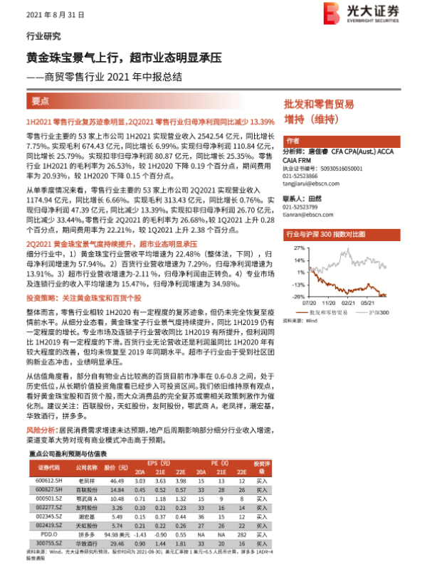 【光大证券】【20210831】商贸零售行业2021年中报总结:黄金珠宝景气上行,超市业态明显承压-22页