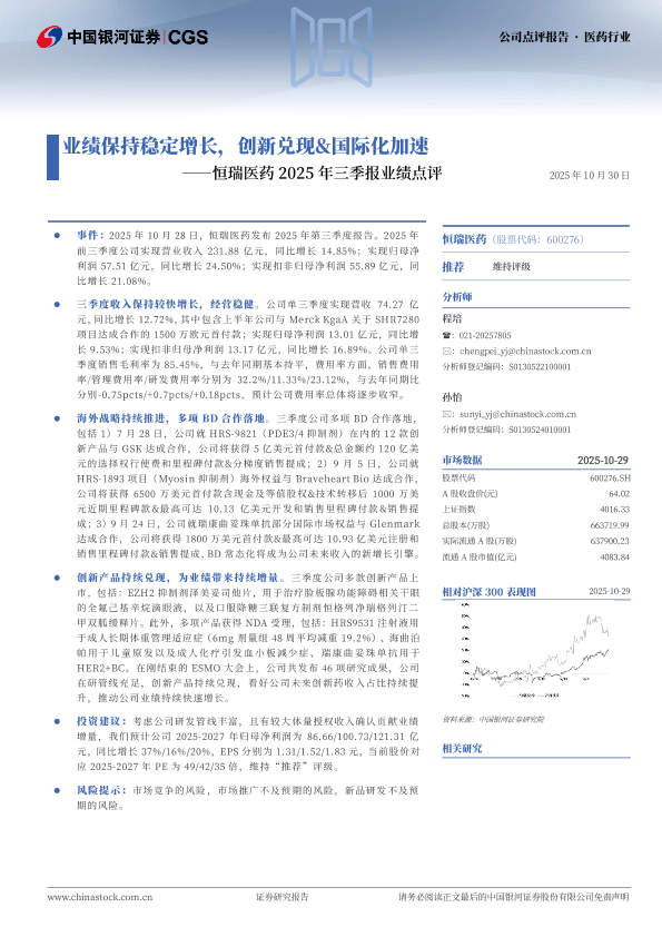 【银河证券】【202510】业绩保持稳定增长,创新兑现&国际化加速——恒瑞医药 2025年三季报业绩点评-4页