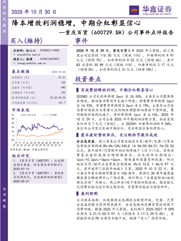 降本增效 中期分红 重庆百货 行业分析 盈利能力