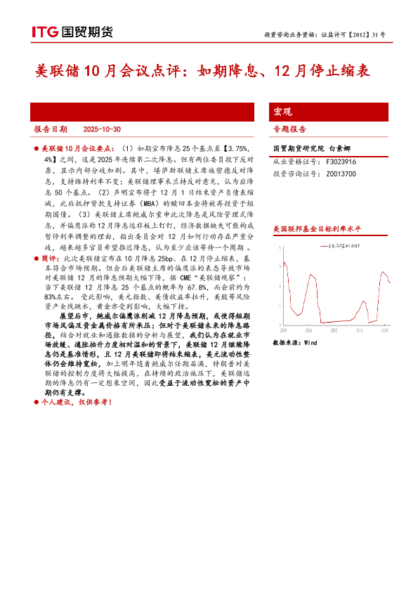 【国贸期货】【202510】美联储10月会议点评:如期降息、12月停止缩表-7页