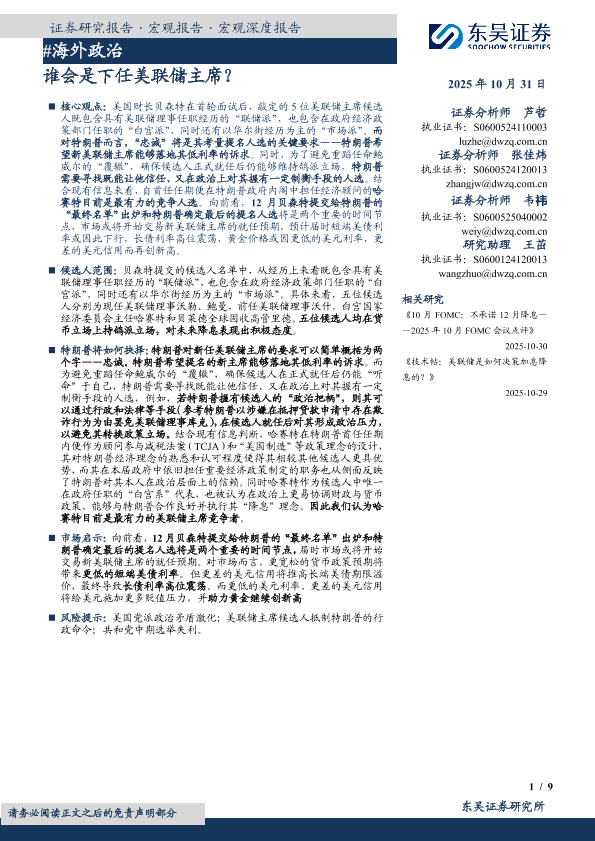 【东吴证券】【202510】海外政治 谁会是下任美联储主席?-9页