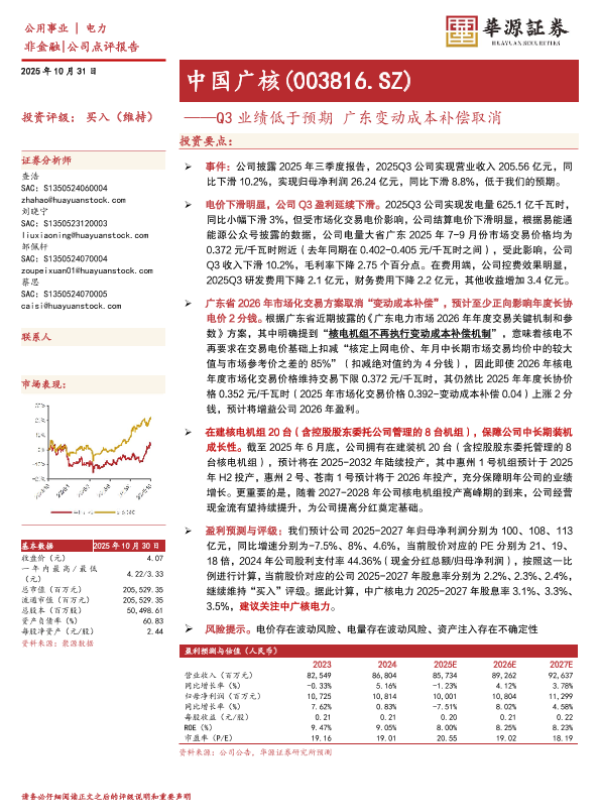【华源证券】【202510】中国广核(003816.SZ)——Q3业绩低于预期广东变动成本补偿取消-3页