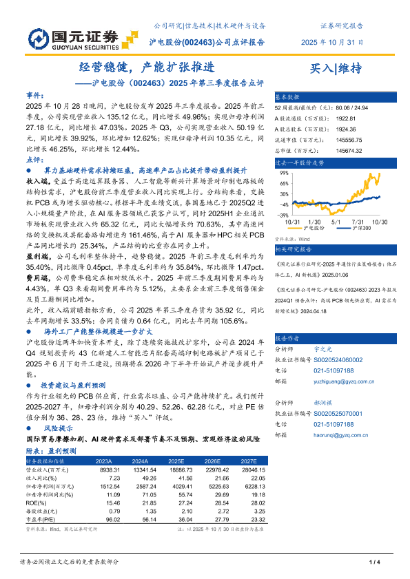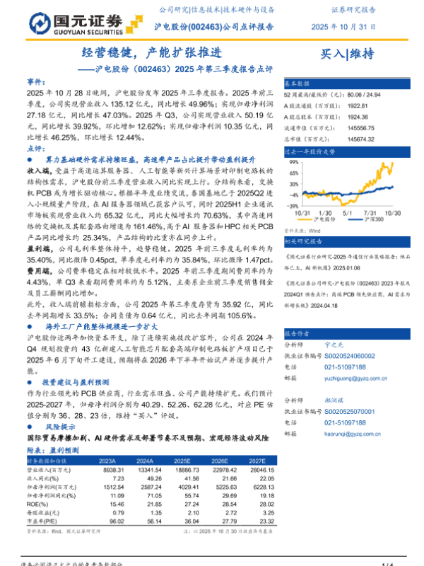 【国元证券】【202510】经营稳健,产能扩张推进——沪电股份(002463)2025年第三季度报告点评-4页