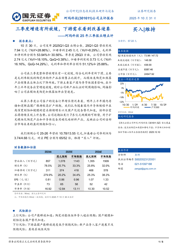 【国元证券】【202510】三季度增速有所放缓,下游需求看到改善迹象——珂玛科技 25年三季报业绩点评-5页