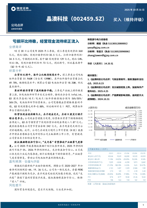 经营现金流 晶澳科技 亏损环比持平 三季报 光伏
