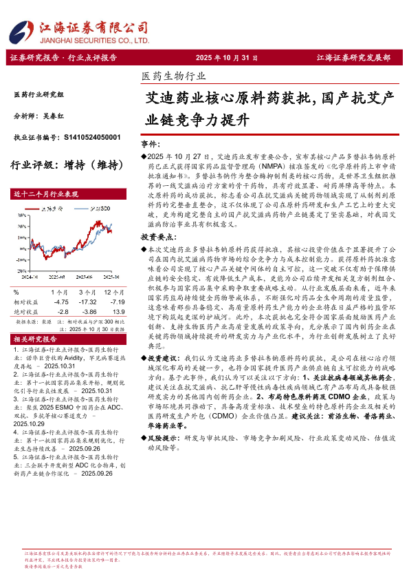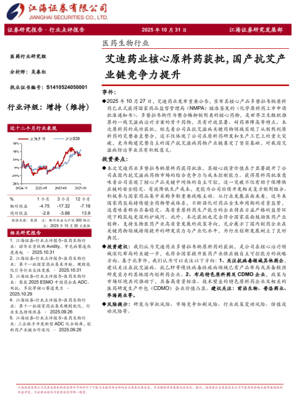【江海证券】【202510】医药生物行业:艾迪药业核心原料药获批,国产抗艾产业链竞争力提升-3页