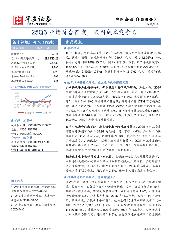 投资评级 油气产量 财报分析 桶油成本 中国海油