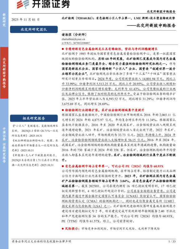 【开源证券】【202510】北矿检测(920160.BJ):有色检测小巨人市占第一,LME牌照+技术壁垒铸就优势-33页