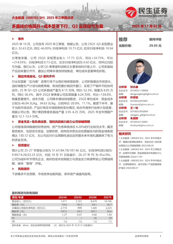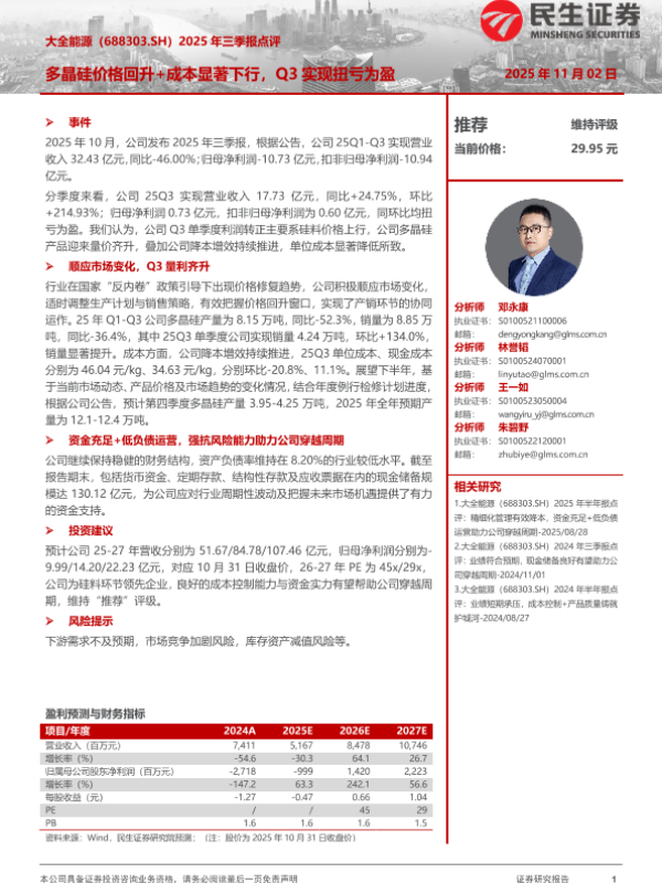 【民生证券】【202510】2025年三季报点评:多晶硅价格回升+成本显著下行,Q3实现扭亏为盈-3页