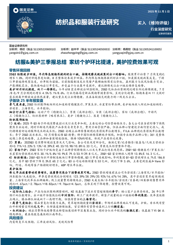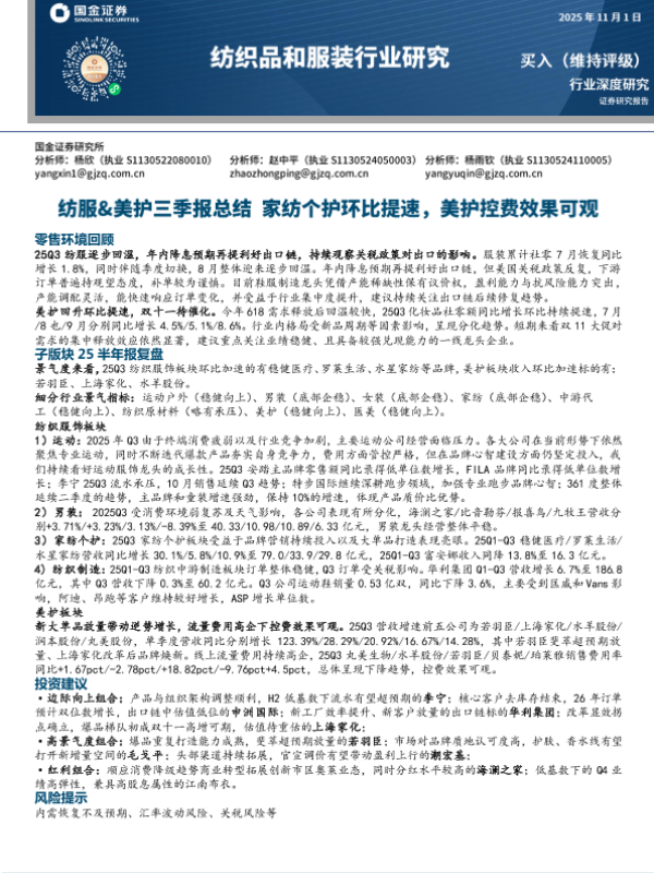 【国金证券】【2025】纺服&美护三季报总结:家纺个护环比提速,美护控费效果可观-18页