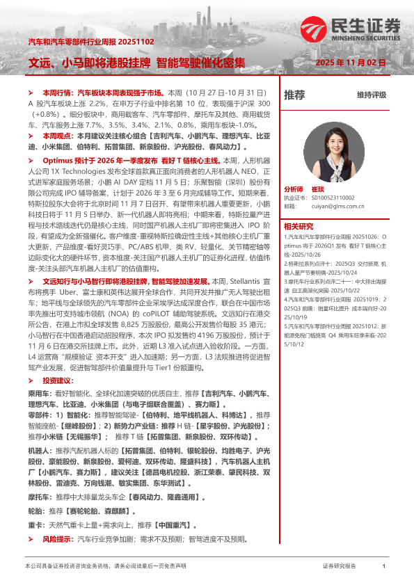 【民生证券】【202511】汽车和汽车零部件行业周报:文远、小马即将港股挂牌 智能驾驶催化密集-27页