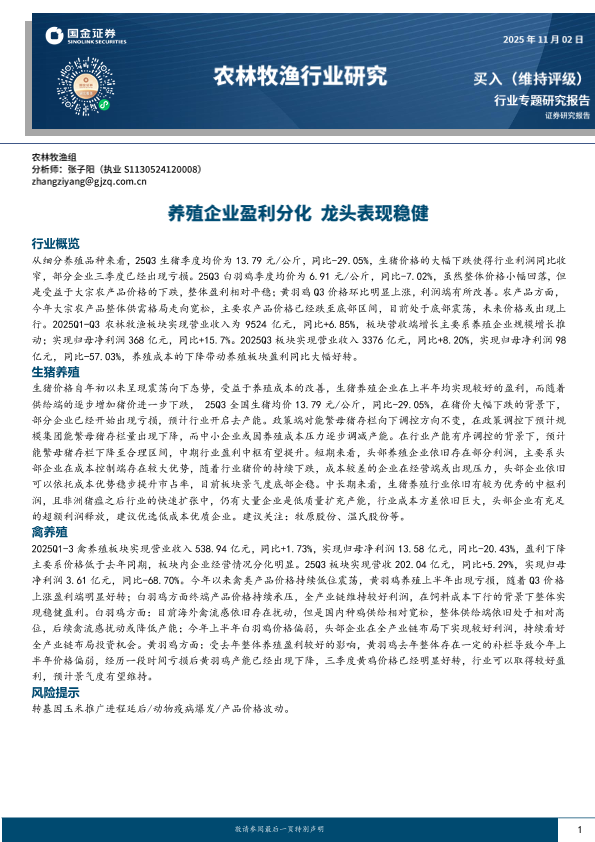 【国金证券】【2025】农林牧渔行业研究:养殖企业盈利分化 龙头表现稳健-16页