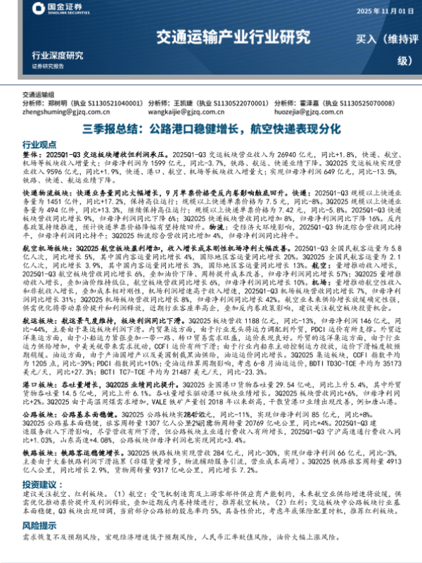 【国金证券】【2025】交通运输产业行业研究三季报总结:公路港口稳健增长,航空快递表现分化-23页