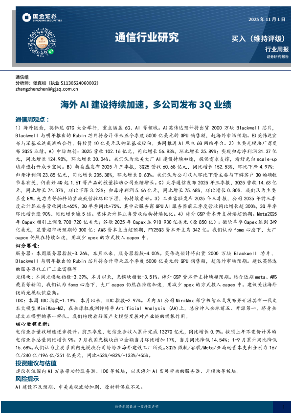 【国金证券】【2025】通信行业周报:海外AI建设持续加速,多公司发布3Q业绩-10页