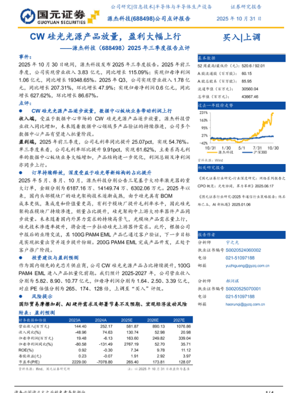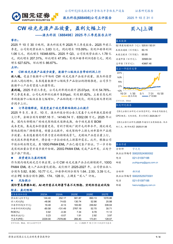 【国元证券】【202510】CW硅光光源产品放量,盈利大幅上行——源杰科技(688498)2025年三季度报告点评-4页