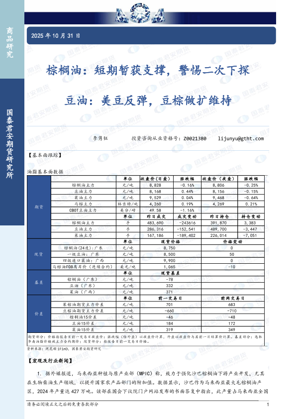 【国泰君安期货】【202510】棕榈油:短期暂获支撑,警惕二次下探豆油:美豆反弹,豆棕做扩维持-3页